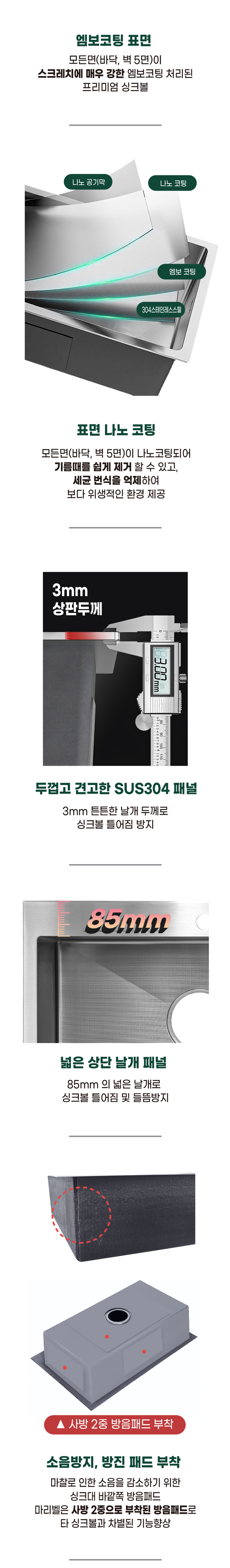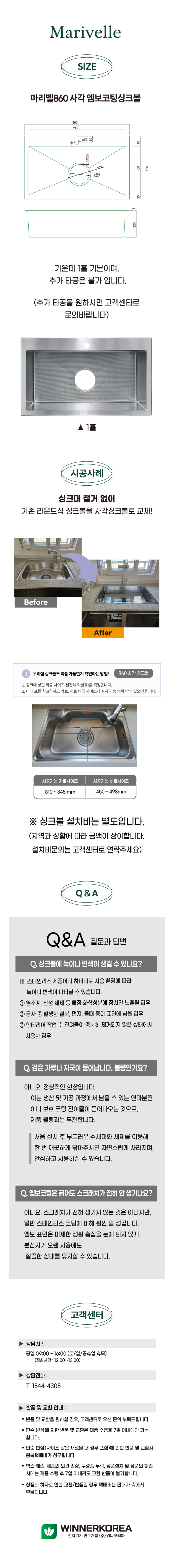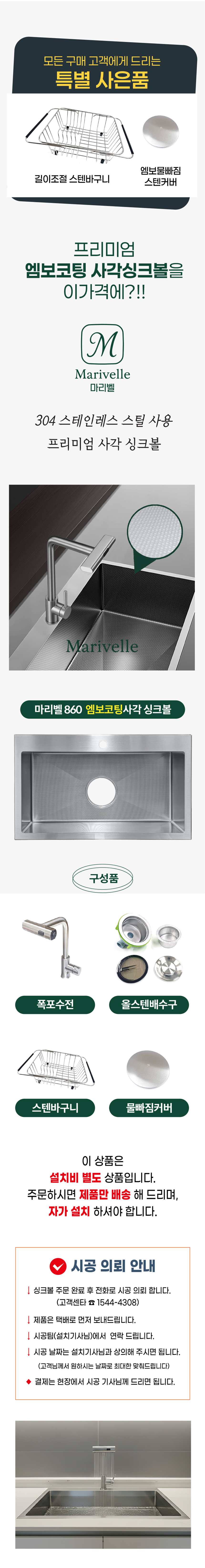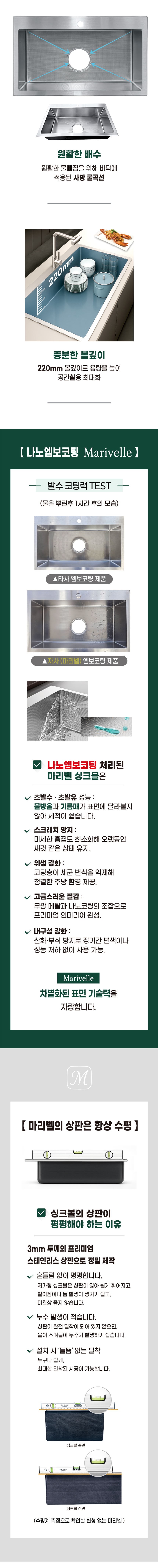 304 스테인레스로 제작된 마리벨 사각싱크볼은 나노엠보코팅으로 처리되어 스크래치에 강하고, 위생적이고 내구성이 강합니다.